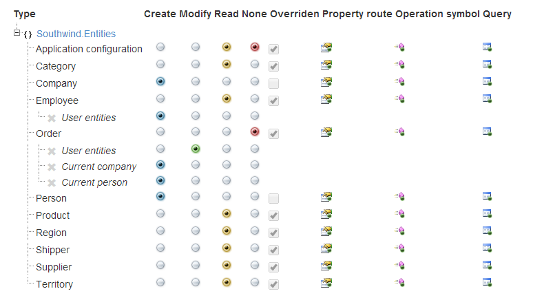 - Properties: If necessary, individual properties can be granted or denied to a particular role. Denied properties are hidden in the user interface, and when a request is received and the columns are also hidden in any search dialog. (i.e., hide Salary property on Employee). By default the property settings are inherited from the settings of the type that owns the property, but this behaviour can be avoided for special, risky, properties.